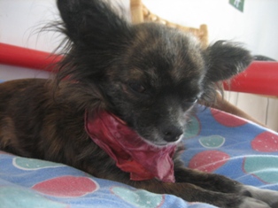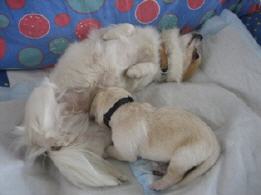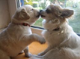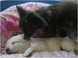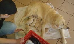Heute durfte Julie richtig Mama spielen. Sie hat dem kleinen Buddha ihren Bauch hin gehalten, auch wenn der mit der Miniausgabe der Milchbar wenig anfangen konnte. Julie ist ein bisschen mit trächtig geworden, und es hat sogar den Anschein als hätte sich etwas Milch gebildet. Der Größenunterschied zwischen den Welpen und Julie macht jedoch das Säugen unmöglich, aber Mama hat ja auch genug Milch für alle.