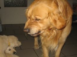 So langsam lässt Sandy Ihre Babies alleine, immer öfter liegen die Welpen in der Box und die Mama im Wohnzimmer. Jetzt dürfen wir auch immer mal ein Baby aus der Box nehmen, ohne das Sandy gleich unruhig wird. Auch Tante Julie und Tante Finley können sich den Welpen nähern ohne das Sandy gleich knurrt. Dennoch bleibt Sandy eine tolle Mutter, die sich um Ihre Babies kümmert, wie es sich gehört.